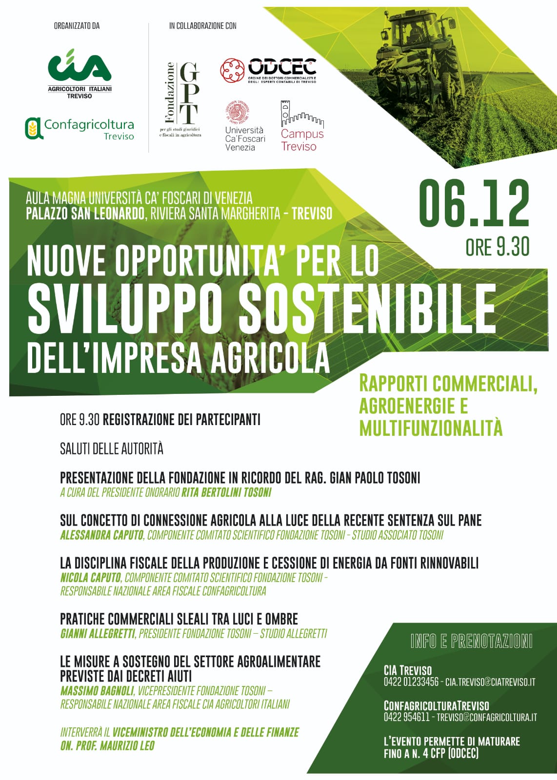 Organizzato unitamente a Confagricoltura e CIA Agricoltori Italiani di Treviso dedicato ad argomenti di attualità: dal concetto di “connessione” alla luce della recente sentenza sul pane, alla fiscalità della produzione di energia da fonti rinnovabili, alle luci e ombre della disciplina delle pratiche commerciali sleali e alle misure a sostegno del settore agroalimentare di cui ai decreti “aiuti”.